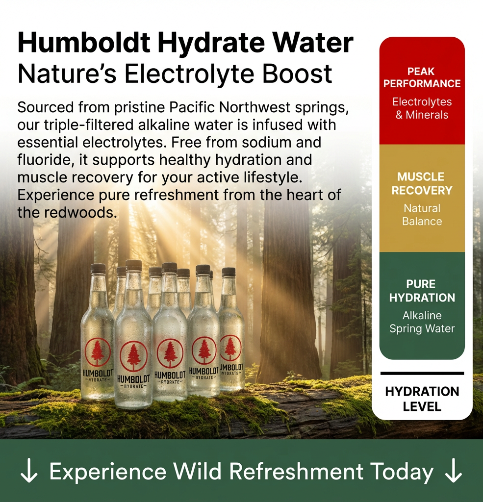 HUMBOLDT HYDRATE Water is a refreshing and healthy beverage that can be enjoyed in any setting. HUMBOLDT HYDRATE Water is pure clean oxygenated alkaline water with no added sugars or artificial flavors.